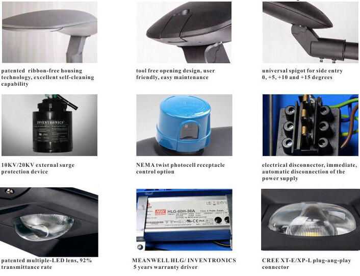 Le lampadaire a trois tailles de S, M et L. LED Lumileds3030 sont disponibles. La source de lumière LED S convient pour 50w-70w, M convient pour 80w-120w, L convient pour 150W-240W; lumen élevé, faible atténuation de la lumière, haute luminosité, angle d'installation réglable.Bonnes performances imperméables et longue durée de vie.